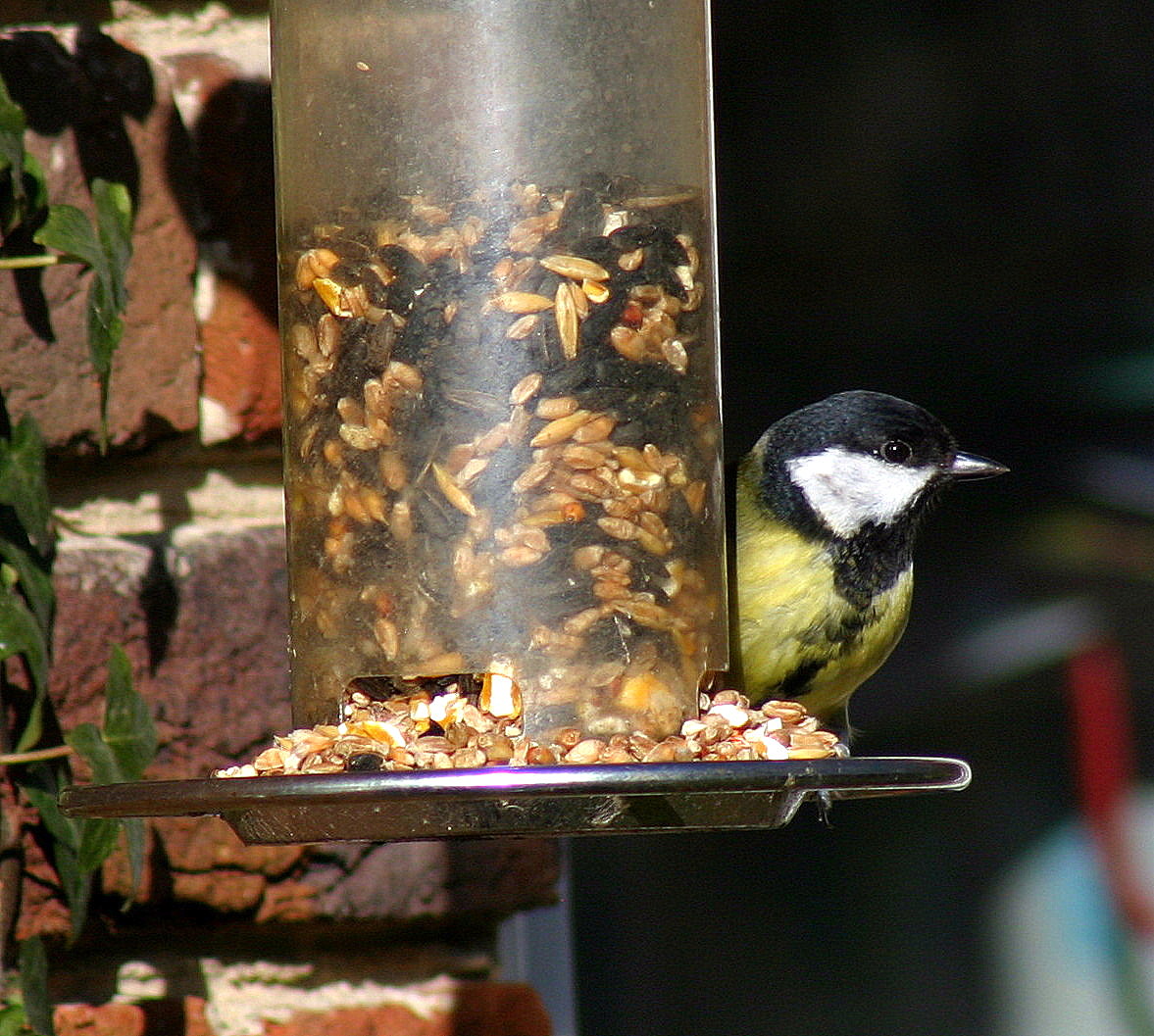 This Great Tit was helping himself to the peanuts. Access had been made very easy due to the large hole the squirrels had made in our “squirrel proof” feeder. Of course I don’t begrudge him the peanuts, I don’t mind that the squirrels managed to break into feeder. My only objection is that I paid good money and that the manufacturer claimed that it was squirrel proof. I guess their product testing didn’t take into account that juvenile squirrels are small and that their head and shoulders could get through the same gaps that birds use. Oh, and that squirrel teeth must be diamond tipped as they can quite happily gnaw through steel mesh.