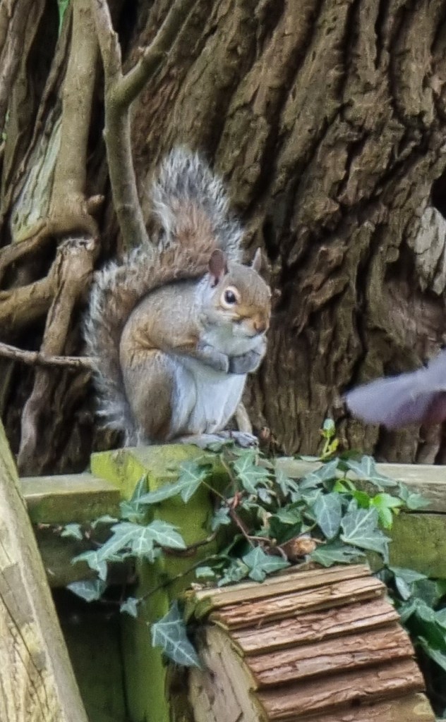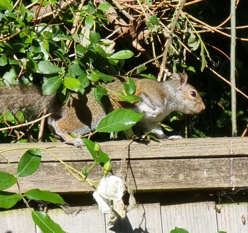 Our back garden fence provides a wildlife highway, running North to South. Here is a Grey Squirrel, heading in a southerly direction.